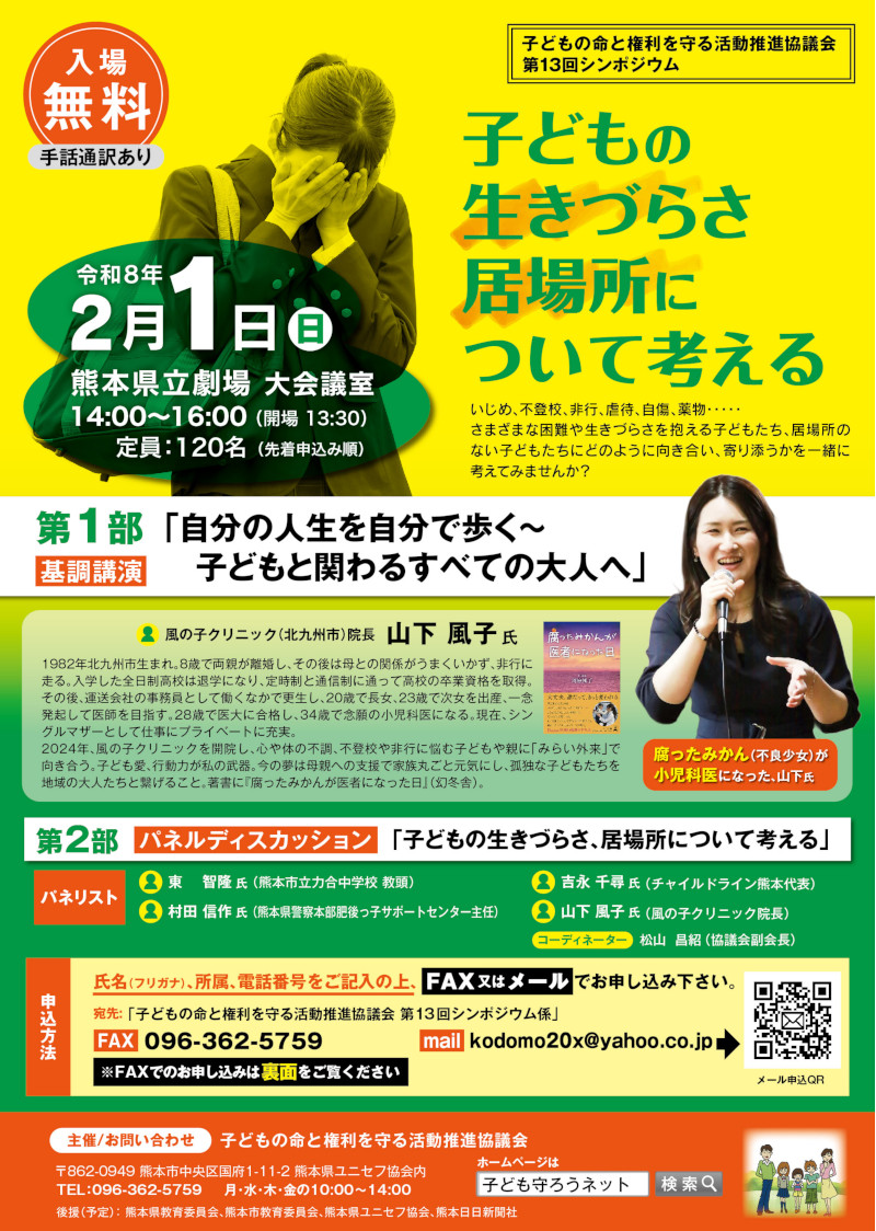 | 主な内容 | 講和「条約改正の趣旨と子どもたちのネット環境」 松川 由美氏(モバイル・ネットワーク研究所代表) 講和とトークディスカッション 「ネットに出会いを求める子どもたちを受け止める」 田中慎一郎氏(熊本市教育委員会総合支援課学校サポート班指導主事) |